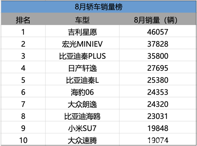 7 月份卖 31237 辆排第二,8 月 35800 辆排第三,销量其实在涨,只是被宏光 MINI EV 的 “爆发式增长” 超车。